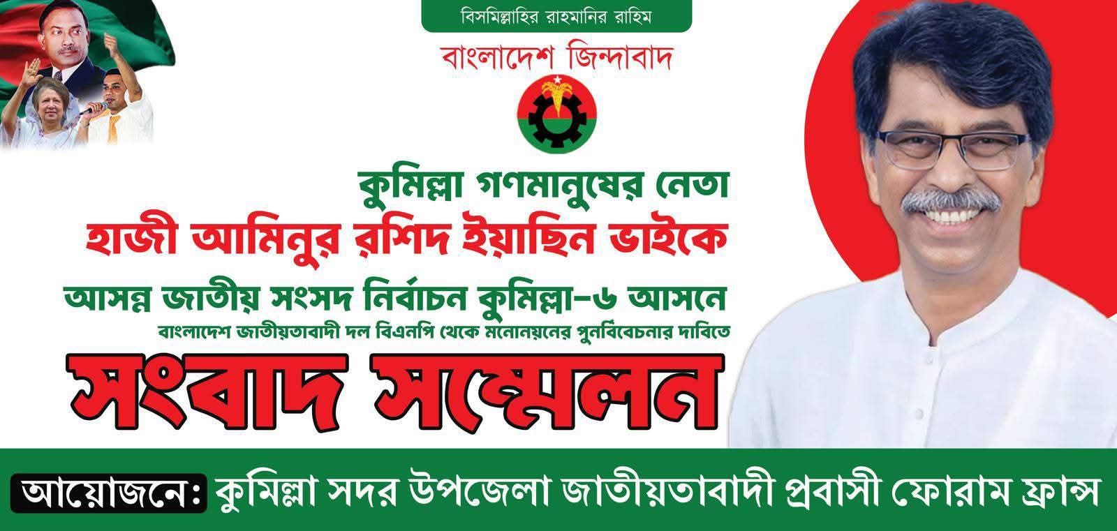 কুমিল্লা সদর- ৬ আসনে হাজী আমিন উর রশিদ ইয়াছিনকে মনোনয়ন দেওয়ার দাবিতে ফ্রান্সে সংবাদ সম্মেলন