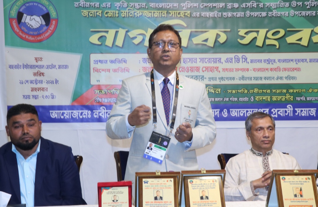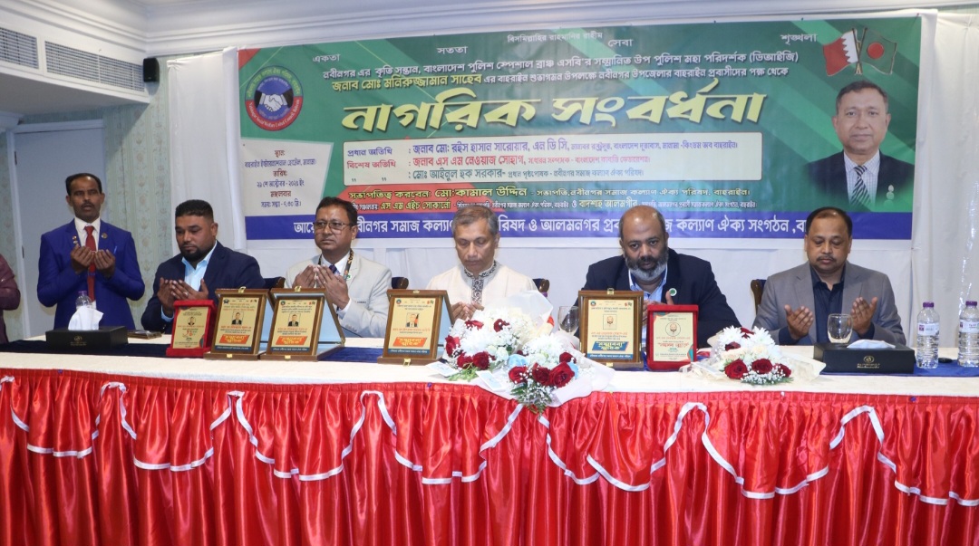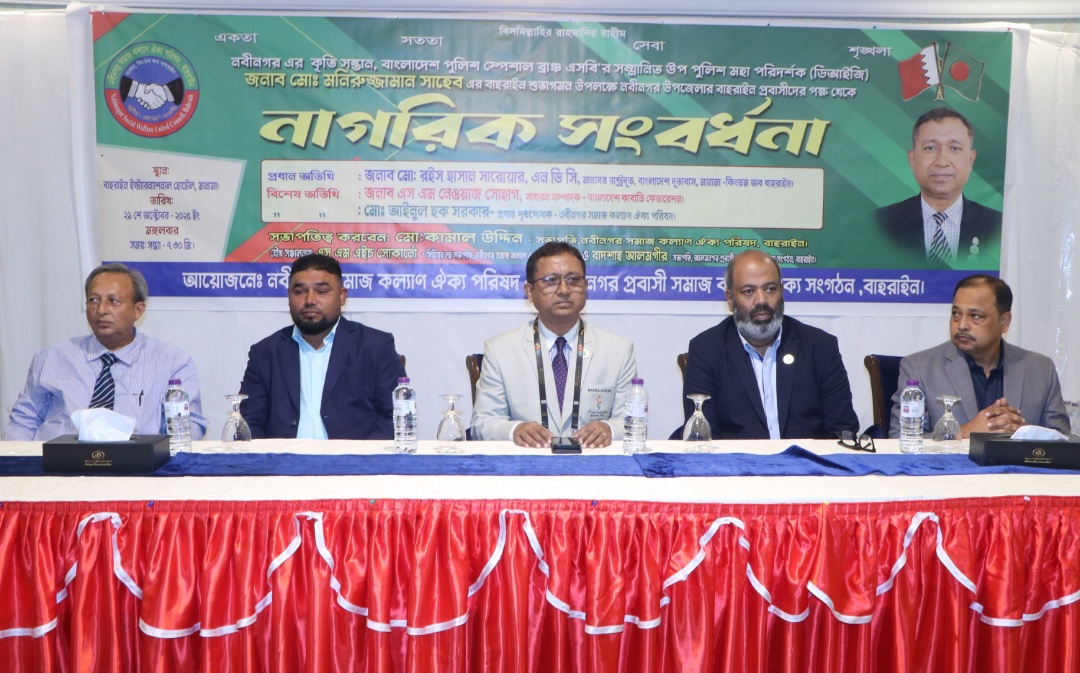 বাংলাদেশ পুলিশ বাহিনীর স্পেশাল ব্রাঞ্চ এসবি’র উপ পুলিশ মহাপরিদর্শক (ডিআইজি) মোঃ মনিরুজ্জামান কে নাগরিক সংবর্ধনা প্রদান করেছে নবীনগর সমাজ কল্যাণ ঐক্য পরিষদ বাহরাইন।